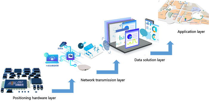 UWB indoor positioning solution consists of positioning hardware layer, network transmission layer, data solution layer and application layer. Positioning hardware layer is the main part of the solution, including micro base station and micro tag. Network transmission layer is used to transfer the data collected by positioning micro base station to data center. Data solution layer is the key to complete the tag orientation calculation. Application layer completes presentation according to the needs of customers.